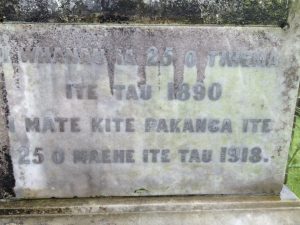 In late 2014 I took a scrubbing brush to it and removed much of the lichen and moss growing on it. That revealed the date of his death, 25th March 1918. It is nearly one hundred years since that date and we his mokopuna from his brothers and sisters wish to honour him once more to ensure that our own mokopuna remember him.